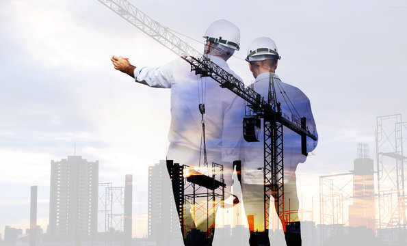 Silhouette of Survey Engineer and construction team working at site over blurred  industry background with Light fair Film Grain effect.Create from multiple reference images together