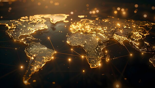 Global map with glowing connections between cities, representing the spread of digital network technology across multiple countries.