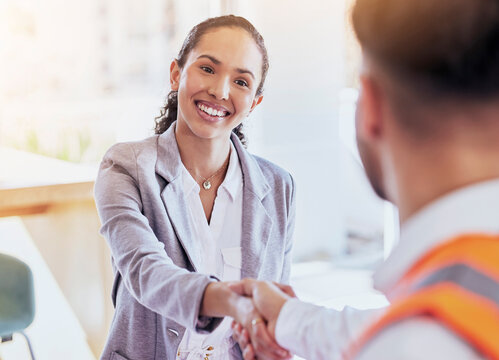Business people, architect and handshake for partnership, deal or agreement in construction at office. Woman shaking hands with contractor or engineer for b2b, hiring or recruitment for architecture