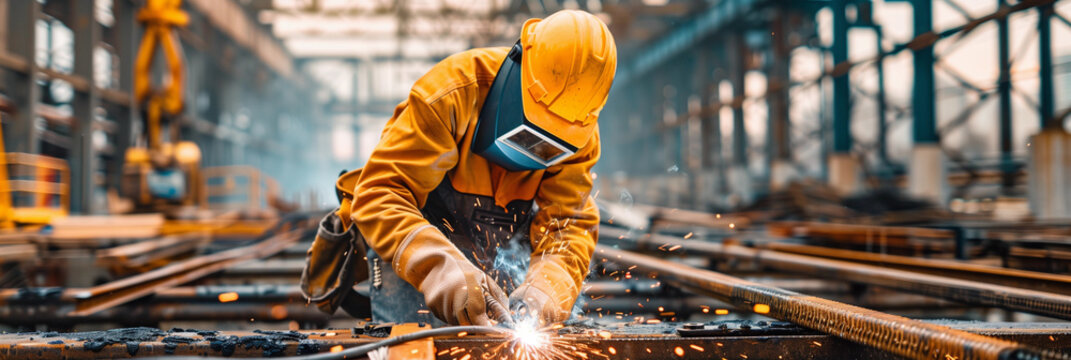Closeup welder construction worker welding steel reinforcement banner building infrastructure engineer work site oh&s safety orange protective gear helmet gloves mask laborhire recruitment labor job