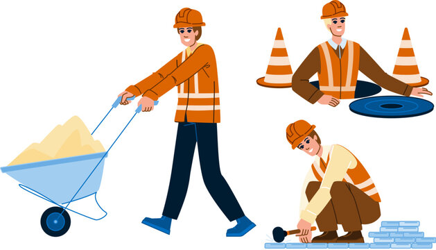 Construction site is laying new asphalt pavement, road construction workers and road construction machinery scene. Highway construction site scene. Asphalt road roller with heavy vibration roller.