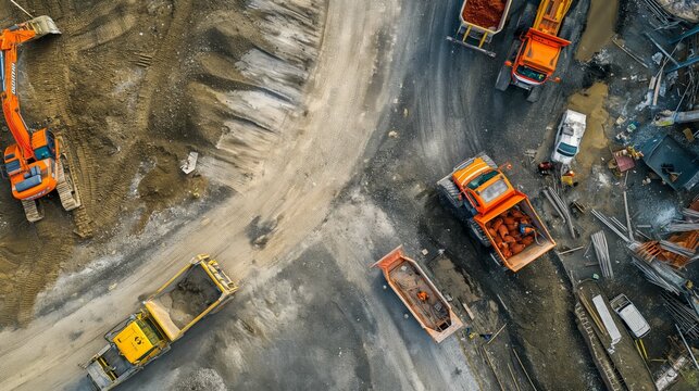 Aerial view of large road construction site with several industrial machines night timelapse.