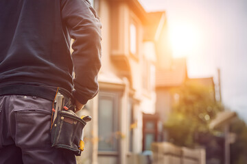 A back view of a repair man standing in front of a house on a bright, sunny day