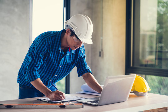 Architect & Engineer working drawing document about project planning and progress of work schedule on the home building construction site