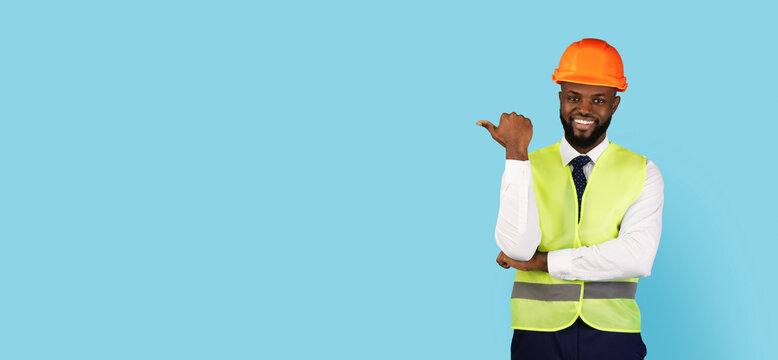Construction worker with hard hat and safety vest smiling confidently at worksite with equipment background. Professional builder in protective gear on job site. Safety construction concept