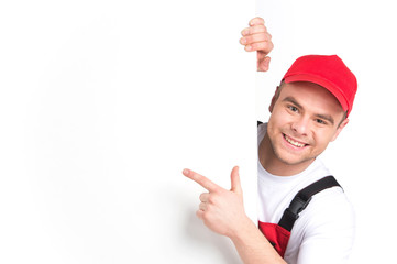 Hispanic young man wearing handyman uniform pointing aside with hands open palms showing copy space, presenting advertisement smiling excited happy