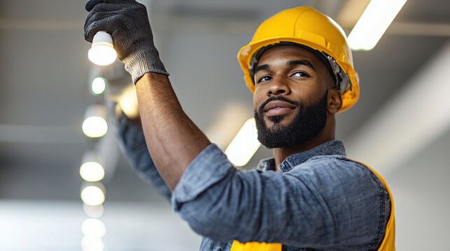 Worker installing smart LED lights on construction site, A skilled construction worker wearing a hard hat and gloves installs high-quality lighting in a modern workspace.