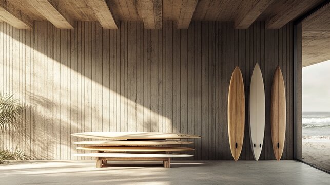 A minimalist beach shack with surfboards stacked neatly against the wall. digital