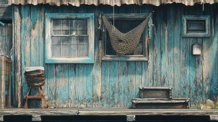 A blue house with a red roof and a window. The house is old and abandoned. The grass is green and the sky is cloudy