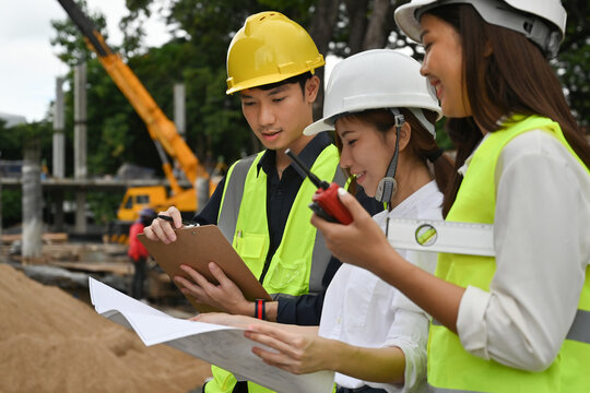 Diverse Team of Specialists Taking a Walk Through Construction Site. Real Estate Building Project with Senior Civil Engineer, Architect, General Worker Discussing Planning and Development Details.