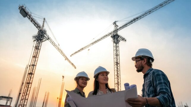 Two construction professionals supervise building project. Woman engineer inspects plans worker checks device. Building site with cranes, structure under construction. Outdoor scene suggesting
