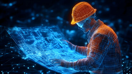 Engineers collaborating on construction plans in a modern workspace surrounded by trees