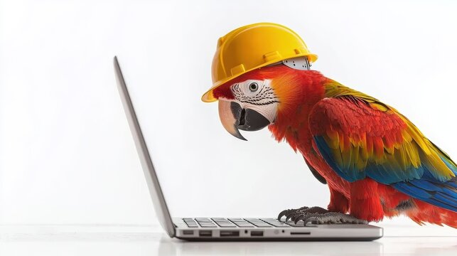 A colorful parrot wearing a yellow hard hat types on a laptop, blending humor with a construction theme.