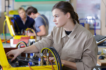 Group of students learning together to build electronic car model construction project. Innovative technology development