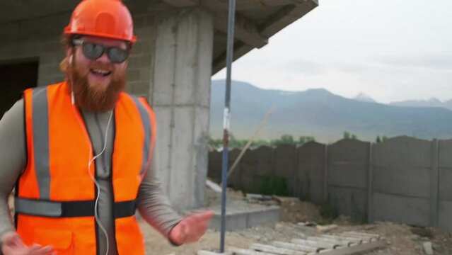 Handsome red bearded civil engineer in sunglasses dancing with raised hands up and smile on construction site.