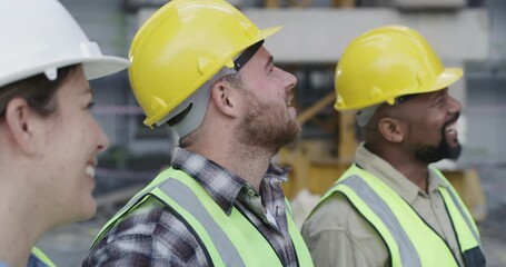 4k slow motion video, group of diversity teamwork, engineers, technician and workers team in safety uniform workwear having discussion while walking through heavy industry manufacturing factory.
