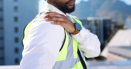 Engineering, health and construction worker with shoulder pain, injury or accident in the city. Medical emergency, professional and male industry employee with a sprain arm muscle working in town.