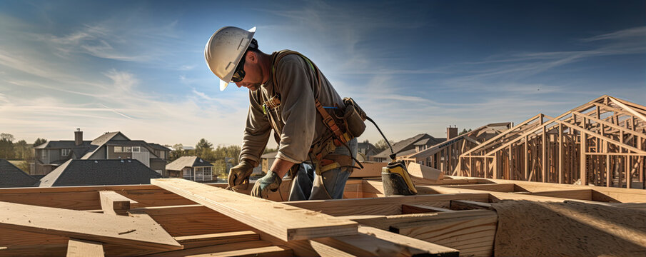 Male workers carpenter wearing safety uniform and yellow hard hat working using hammer nail to on wood at workshop. Man worker wood surrounded piles of wooden pallets in warehouse industry.