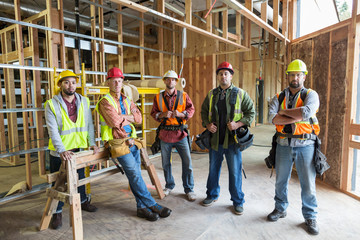 Smiling man with long-sleeved inserts and white hard hat standing on a construction site