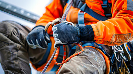 Close-up of a worker wearing safety gear and handling climbing ropes, emphasizing safety and equipment in a high-risk environment.