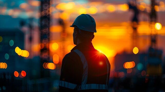 An engineer in silhouette at a construction site emphasizing industry safety. Concept Construction Safety, Engineer Silhouette, Industry Workplace, PPE, Engineering Project