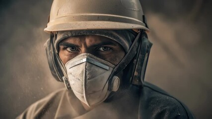 Portrait of a determined construction worker wearing a safety helmet, ear protection, and a dust mask, facing a dusty environment, emphasizing workplace safety and health
