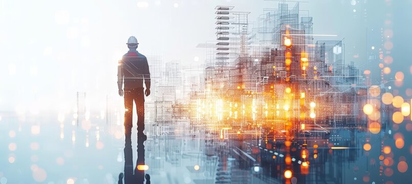 A construction worker stands in a partially renovated space, gazing out at a city skyline as the sun sets, casting warm light through the windows.
