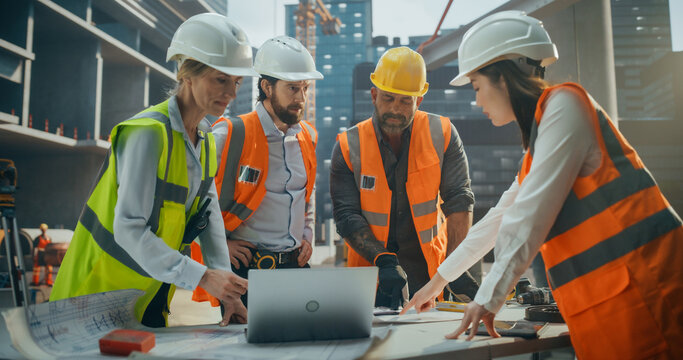 Diverse Multiethnic Team of Construction Workers Having a Meeting Outdoors at a Building Site. Male and Female Infrastructure Company Crew Discussing Office Building Development Plans