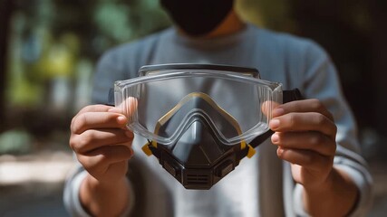 Hands holding a protective respirator style mask, designed for safety in industrial and construction settings, focusing on prevention and protection. cinematic color correction, natural uneven
