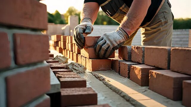 Construction worker bricklayer lays bricks for new structure at building site using tools and materials for masonry work