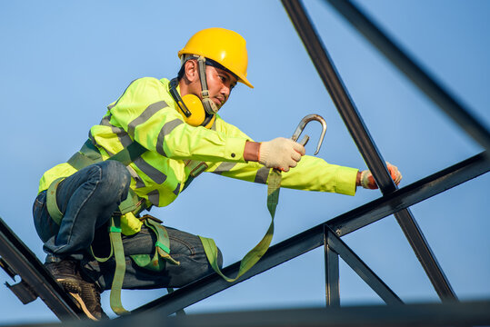 Asian construction worker Wear safety clothing and harnesses to do construction work on steel roof structures.