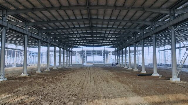4k Video Aerial View of Large Factory Building Site Construction Plant Steel Frame Warehouse Progress