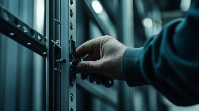 Professional worker installing solar panel under blue sky promoting renewable energy