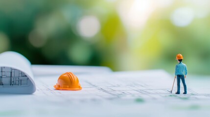 A miniature construction worker figurine standing next to a hardhat placed on a blueprint, highlighting the role of human labor and expertise in the construction industry.
