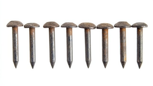 Iron Nails. Row of Sharp Metal Nails in Different Shapes on White Background