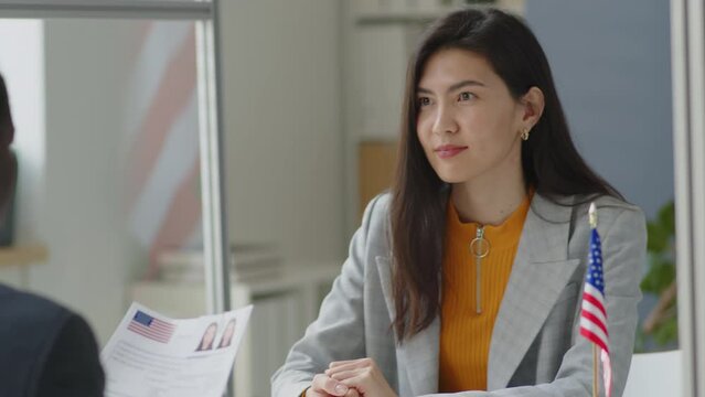 Young Asian woman giving document to officer and answering questions during visa interview in U.S. embassy