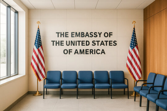 Modern interior of the U.S. Embassy with a row of blue chairs beneath a wall displaying the text “The Embassy of the United States of America,” flanked by two American flags, symbolizing visa services