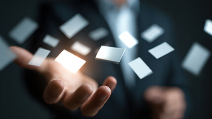 Business consultant hand floating card focus corporate technology innovation abstract concept dark background selective focus dynamic scene