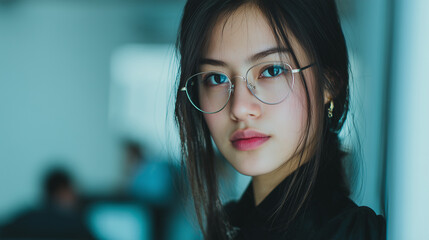 photo, asian business, Cute businessgirl. Glasses. Minimalist office in the background, out of focus