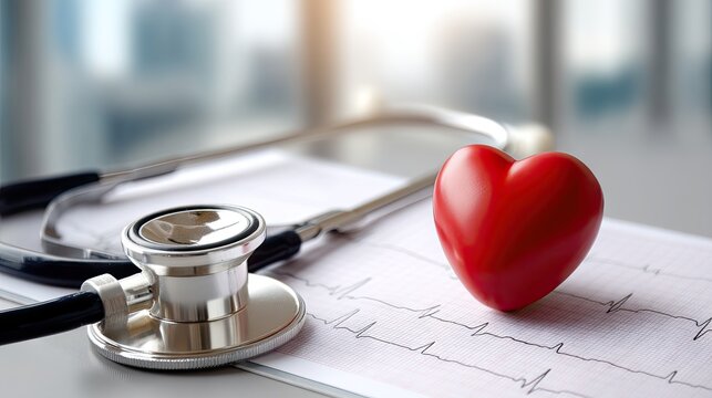 Medical tools and heart symbol on a table, representing health monitoring and care in a hospital setting during daylight hours