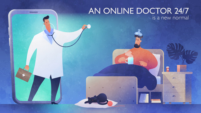 24/7 Online Doctor concept banner template. Telemedicine support. A video call of a patient to see a doctor via smartphone at nighttime. Healthcare, medicine and technology vector illustration.