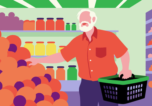 An older man shopping for fresh produce in a brightly colored grocery store. Illustration