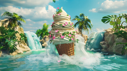 A melting ice cream cone transforms into a vibrant tropical island paradise complete with lush foliage and shimmering waterfalls High Quality High Clarity Space for Text Prof