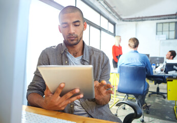 Hes the consummate young professional. a designer using a digital tablet while working in an office.