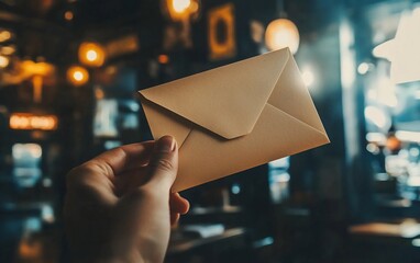 Hand holding a kraft paper envelope in a cafe.