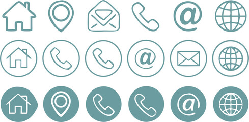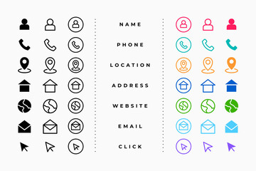 Illustration of contact information icons set, representing communication channels such as address, phone, email, website, and location details
