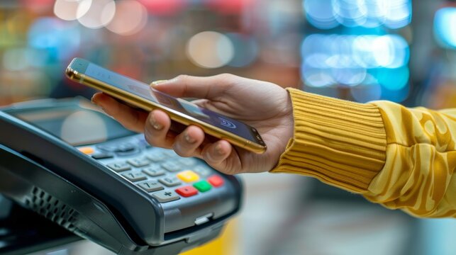 customer using their smartphone to make a payment through Near Field Communication NFC technology, highlighting the convenience and security of contactless payments. Generative AI