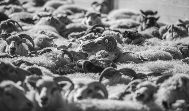many sheep crowded together in a corral before being sheared