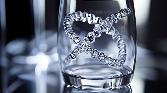 84. Artistic representation of a DNA strand contained within a glass, highlighting the elegant twists of the helix and the clarity of the glass