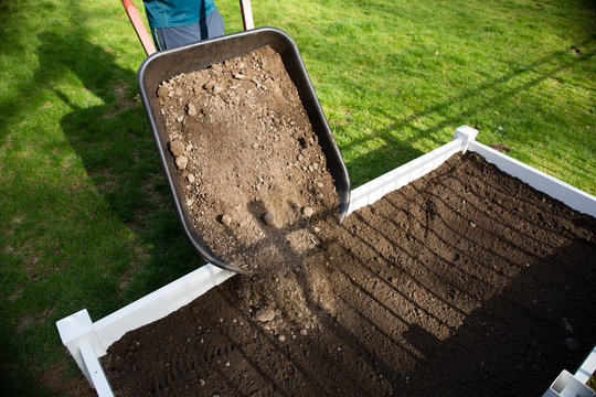 Gloved hand adding autumn leaves to dark soil in a container for gardening